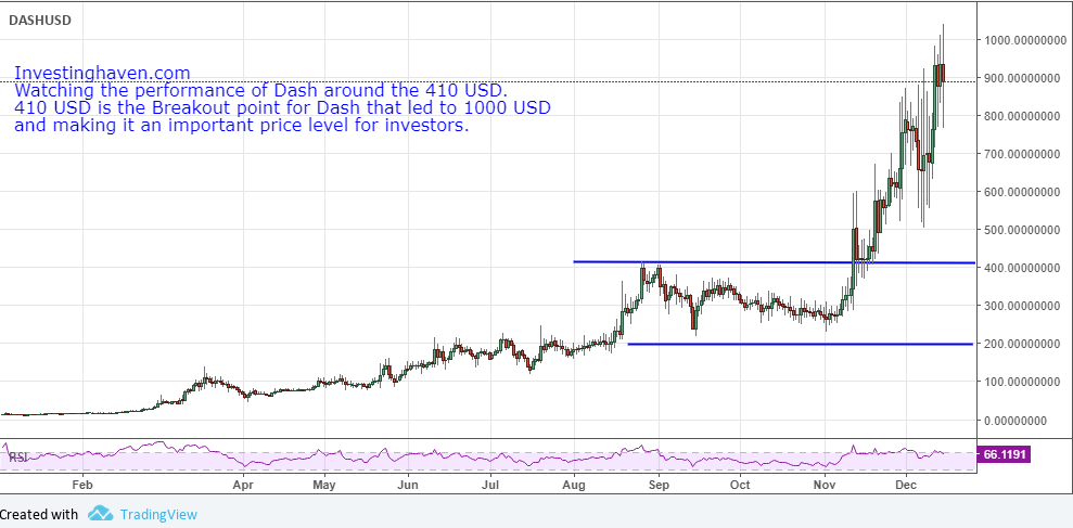 Dash price chart looks great. The price recently broke out of a rectangle to make a strong upwards movement from 400 USD all the way to a 1000 USD. Dash price more than doubled in a matter of 5 weeks.