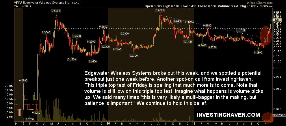 It was only a week ago when we wrote this piece about nano-cap stock Edgewater Wireless, symbol YFI.V, trading on the Toronto Junior exchange: Edgewater Wireless stock on the move, preparing mega breakout