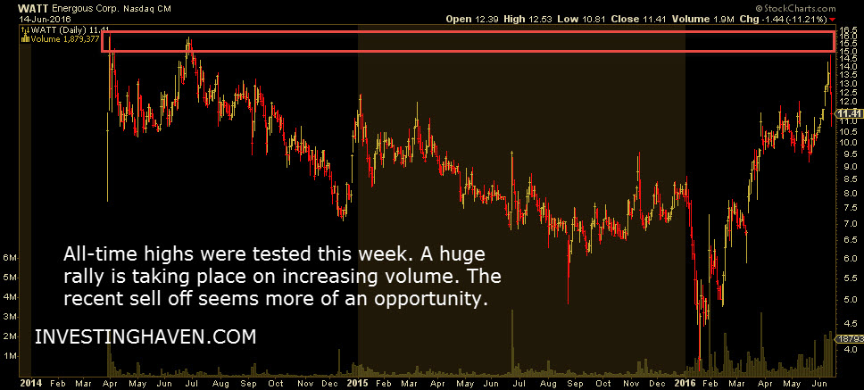 Lately, WATT has gone seen a huge rally, where the company has almost tripled in a time span of 3 months. Interestingly, volume has exploded as price was rallying. That is a sign of accumulation, and that is exactly what we like to see.