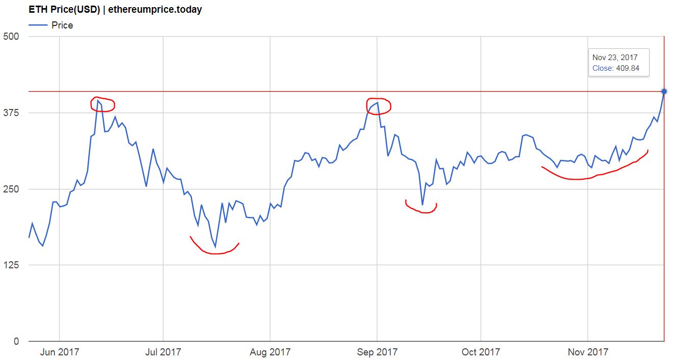 So, here we find ourselves today, after Bitcoin’s spectacular rise, leaving Ethereum behind, with a triple top breakout in Ethereum. Ethereum is breaking through the previous two tops as seen on the chart.