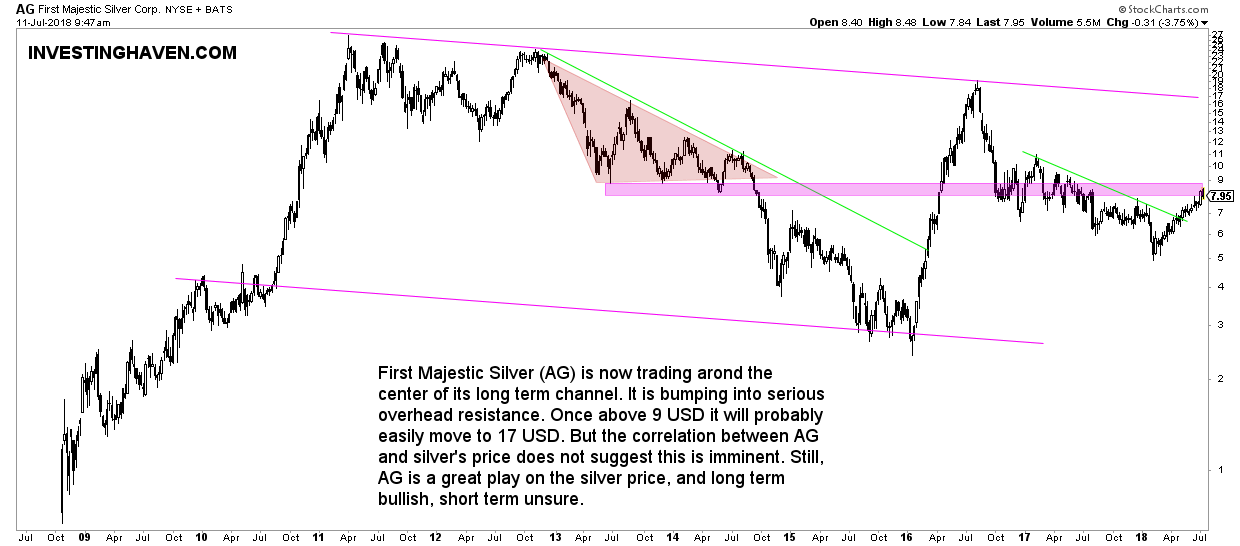 The long term pattern is a channel between $2.50 and $17, with a strong area at the center (purple bar). First Majestic Silver is now trading almost at the center of this range, right at resistance.
