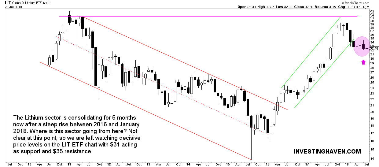 - Chart wise, lithium does not look like it saw an absolute top, on the contrary even. The long term chart of LIT ETF shown below suggests a small pause was taken in 2018, which is the preparation of the next uptrend which may start at any point in 2018.