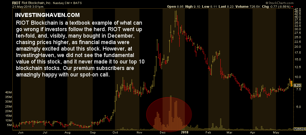 As said, even in a raging bull market like the one in cryptocurrencies and blockchain stocks, it is mandatory to avoid stocks that are not doing the right thing, i.e. create value. It is one of those insights that investors tend to forget when they see a chart unfolding like the one embedded below, only to get in near the top and sell much lower once bad news breaks out. Identifying ‘stocks to avoid’ is crucially important, and you can get a list of 23 blockchain stocks to avoid in our blockchain investing research service.