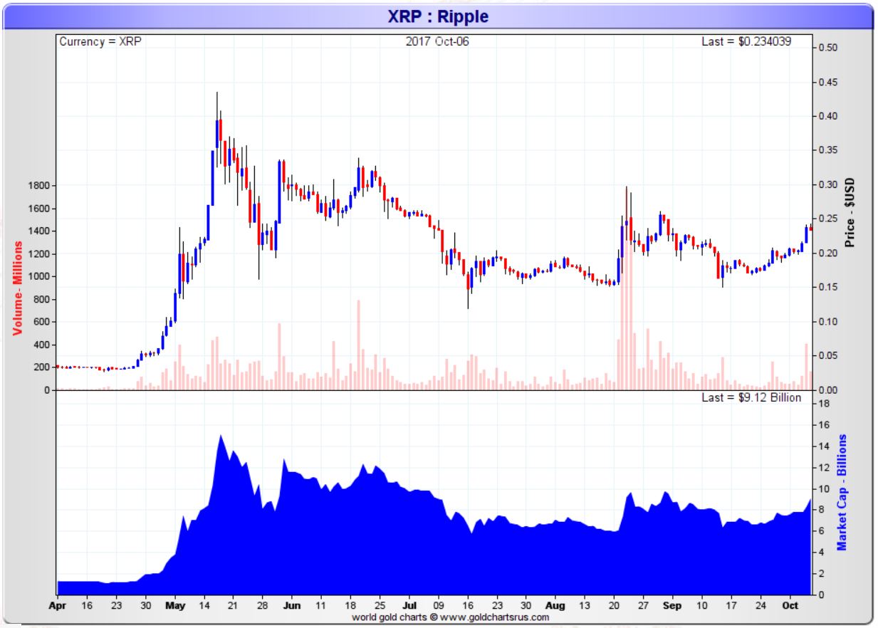 Ripple’s 6 month price chart (see below) makes that point though we did not add our usual annotations on this chart. A trendline could easily be drawn which would connect the peaks of June and August.