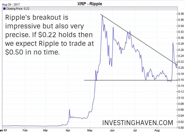 We do not base our trading decisions on articles. However, there are sufficient fundamental drivers which make us believe that Ripple is here to stay. Combined with the breakout on its price chart we expect Ripple to trade at $0.50 by the end of 2017. Chart courtesy: Goldchartsrus.