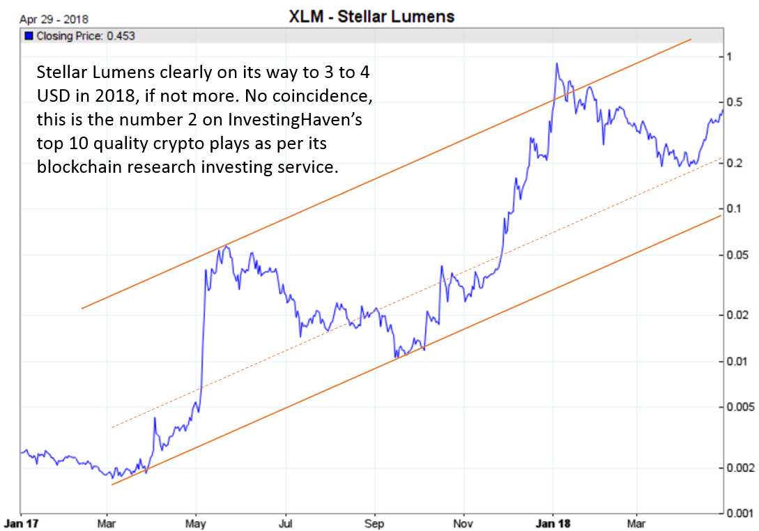 We said early this year that our Stellar Lumens forecast for 2018 would be 4 USD which is ten times higher than it is today. Below chart makes the point that we are well on track.
