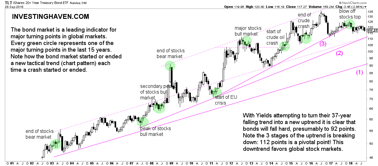 Are we about to witness a once-in-a-generation market turning point? The probability is very high that the answer is ‘yes’. The bond market has arrived at such a pivotal point. A small push higher in interest rates, and it would confirm that the 40-year bull market in bonds in the U.S. has ended. That’s correct, a 4-decade bull market in bonds (bear market in yields) is about to make place for a new bear market in bonds. When do we know for sure, and what does this mean to investors?