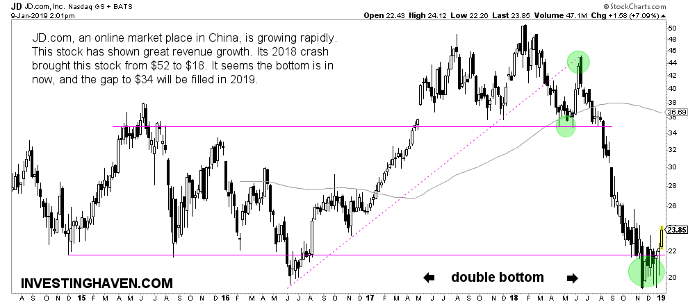 Many may argue that JD is a stock to avoid, we say the opposite. Because of the fact that it crashed in 2018 from $52 to $18, a 52% decline, with solid fundamentals, it is oversold. That’s the type of enticing opportunity we are looking for!