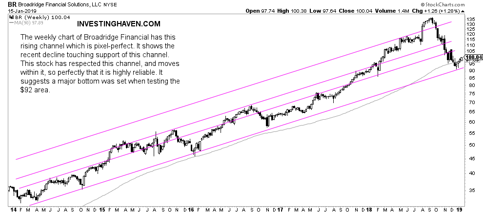 The weekly chart of Broadridge Financial has this rising channel which is pixel-perfect. It shows the recent decline touching support of this channel. This stock has respected this channel, and moves within it, so perfectly that it is highly reliable. It suggests a major bottom was set when testing the $92 area.