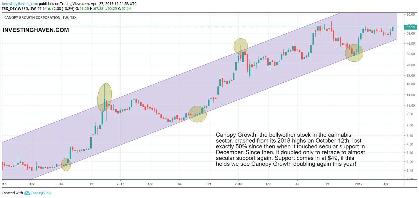 InvestingHaven was very bullish on Canopy Growth (WEED.TO). This bullish Canopy Growth stock forecast published 3 months ago is proof of it. Even premium subscribers (indeed, crypto members also receive other juicy investing opportunities) received a buy alert on January 9th at a price of 39.9, and they are looking at a profit of 69% right now. Talking about spot-on forecasts for 2019, right. After some consolidation Canopy Growth is now set to break out to all-time highs. What does this mean? As a segment leader of the cannabis space it suggests our bullish cannabis stocks forecast is about to get traction. We firmly believe this sector will hold the top spot in the TOP 3 investing opportunities of 2019.