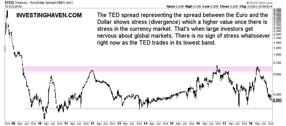 To illustrate this we have included the TED spread which is a good stress indicator for credit and currency markets. That’s where turmoil always starts before it trickles down to other parts of global markets like for instance stock markets. It is “the difference between the interest rates on interbank loans and on short-term U.S. government debt.” TED is an acronym formed from T-Bill and ED, the ticker symbol for the Eurodollar futures contract. It incorporates both interest rates and currency stress. But as seen on below up-to-date chart there is no stress whatsoever.