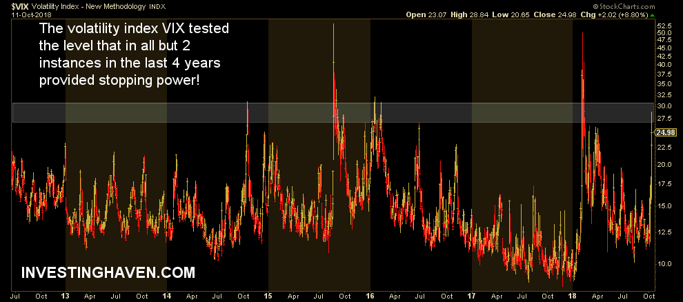 The volatility index rose fast this week. It is a stress indicator. It peaked near the 27-30 level which has acted as strong resistance in all but 2 instances in the last 4 years, arguably even 6 years (although there was no attempt in 2013-2014 to rise till that level).