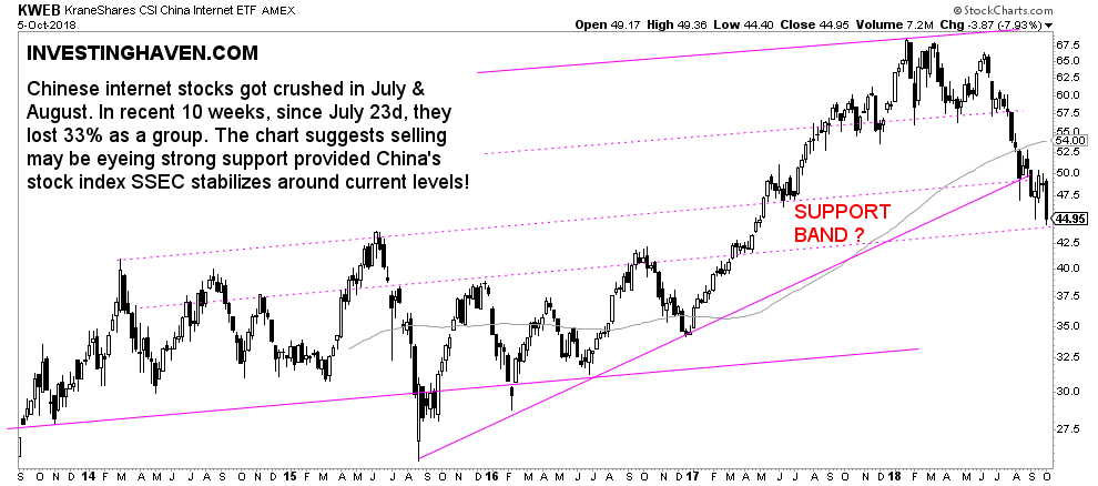 Early August we wrote the following on China internet stocks, specifically in this article 3 Must See Charts On China’s Stock Market Selloff in 2018: “Note how the sell-off in China internet stocks accelerated 3 weeks ago, specifically on July 23d, with a 22% decline in a matter of 3 weeks. Visibly, KWEB has entered a strong support area. Although there is some downside to the 43 level, which is just 7% below current levels, we strongly believe this selloff is about to decelerate.”