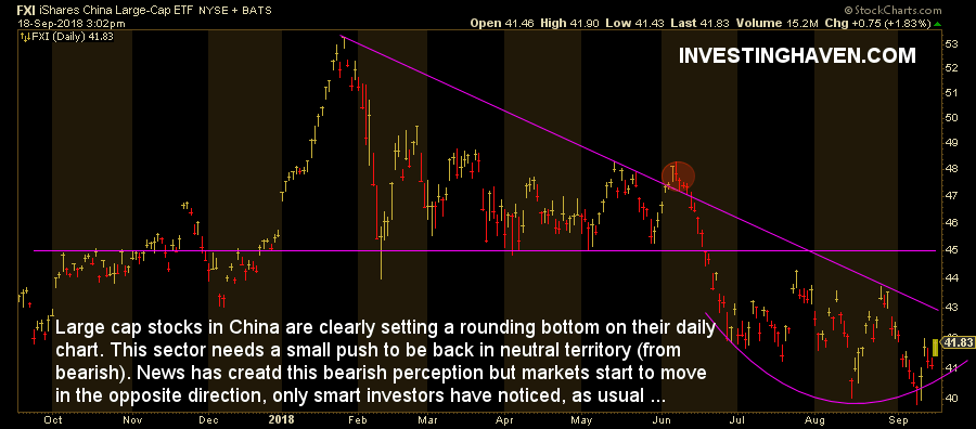 This same picture is confirmed on the FXI ETF (FXI) which represents the largest Chinese stocks. This rounding bottom is already more advanced because large caps are a leading indicator.