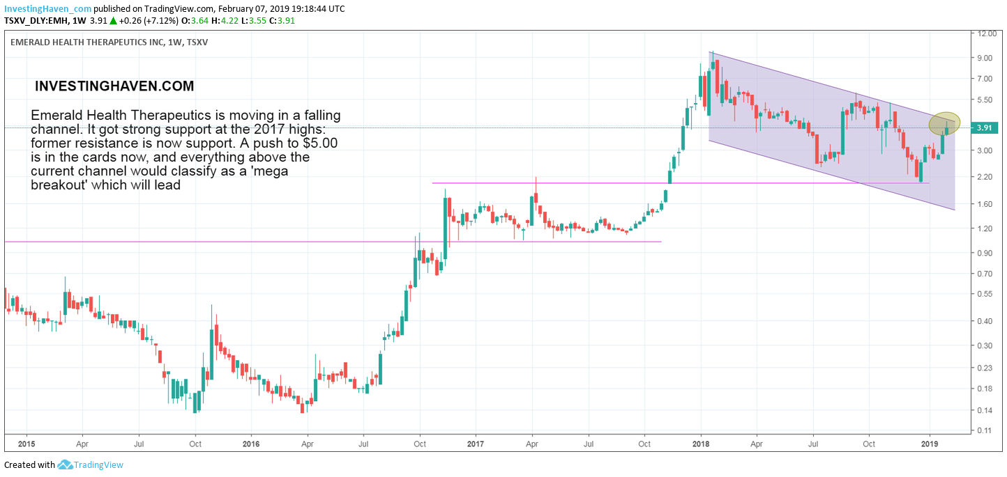 Our Emerald Health Therapeutics forecast 2019 suggested this small cap cannabis stock would rise to $38 in 2019 or 2020. This forecast was published some 5 (!) months ago, after which we also came with a broader Canadian cannabis stocks forecast. In the meantime we see sufficient signs that our forecast is underway. The last confirmation we need is this giant breakout that is about to take place. It would send Emerald Health Therapeutics (EMH.V) many multiples higher, likely close or to our very bullish price target.