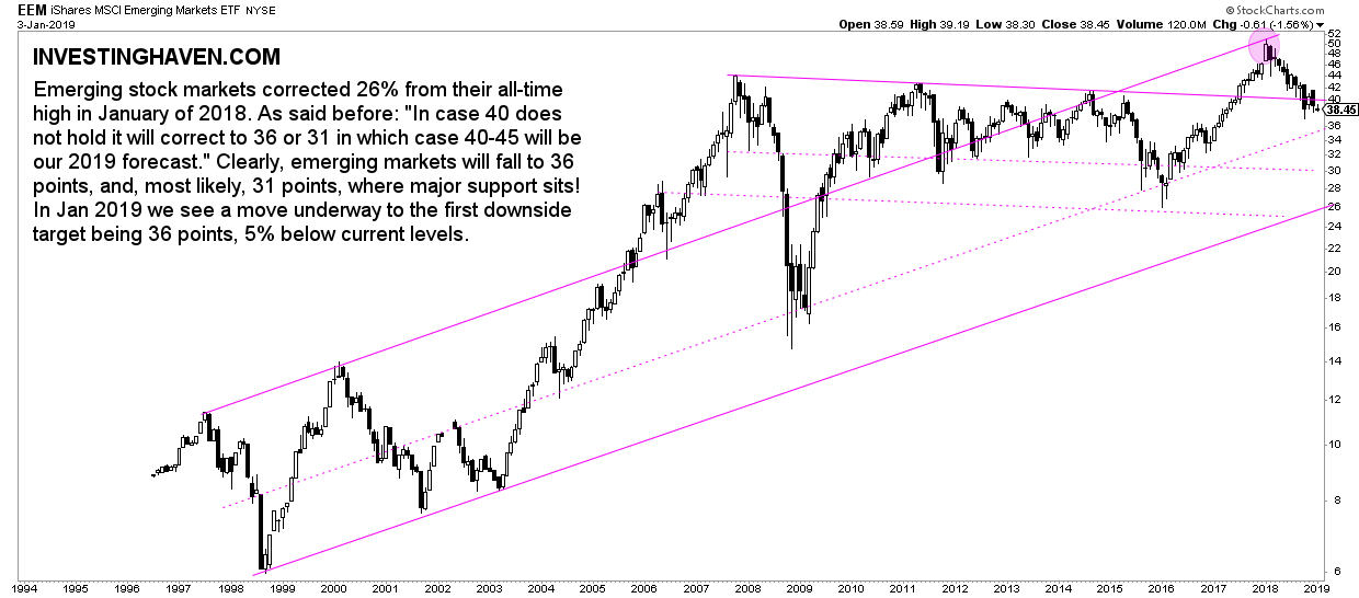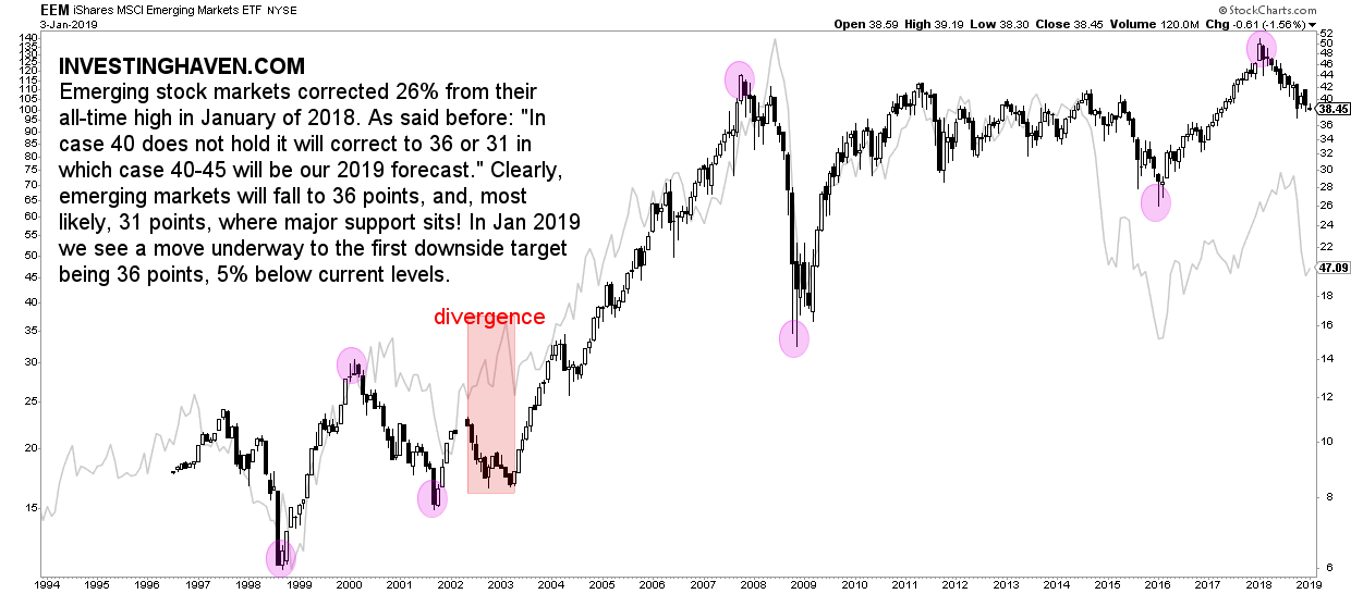 In our emerging markets forecast 2019 as well as published 4 months ago we identified current price levels as critical support. As 2019 kicks off we believe the emerging stock markets (EEM) have limited downside. Admittedly, this goes against the perception which is one of catastrophy in emerging markets as said in great detail in our 15 leading indicators and dominant market trends.. Not only the chart pattern but also the correlation with crude oil suggests that the downside is limited in emerging markets in 2019, and why a juicy entry opportunity may be shaping up especially in some of our top 4 emerging markets for 2019.