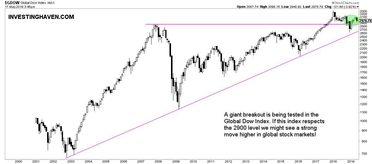 After a peak in January of 2018 we now see some up-and-down right above the breakout level at 2900 points, the top of October 2007. See the green circle on below chart.