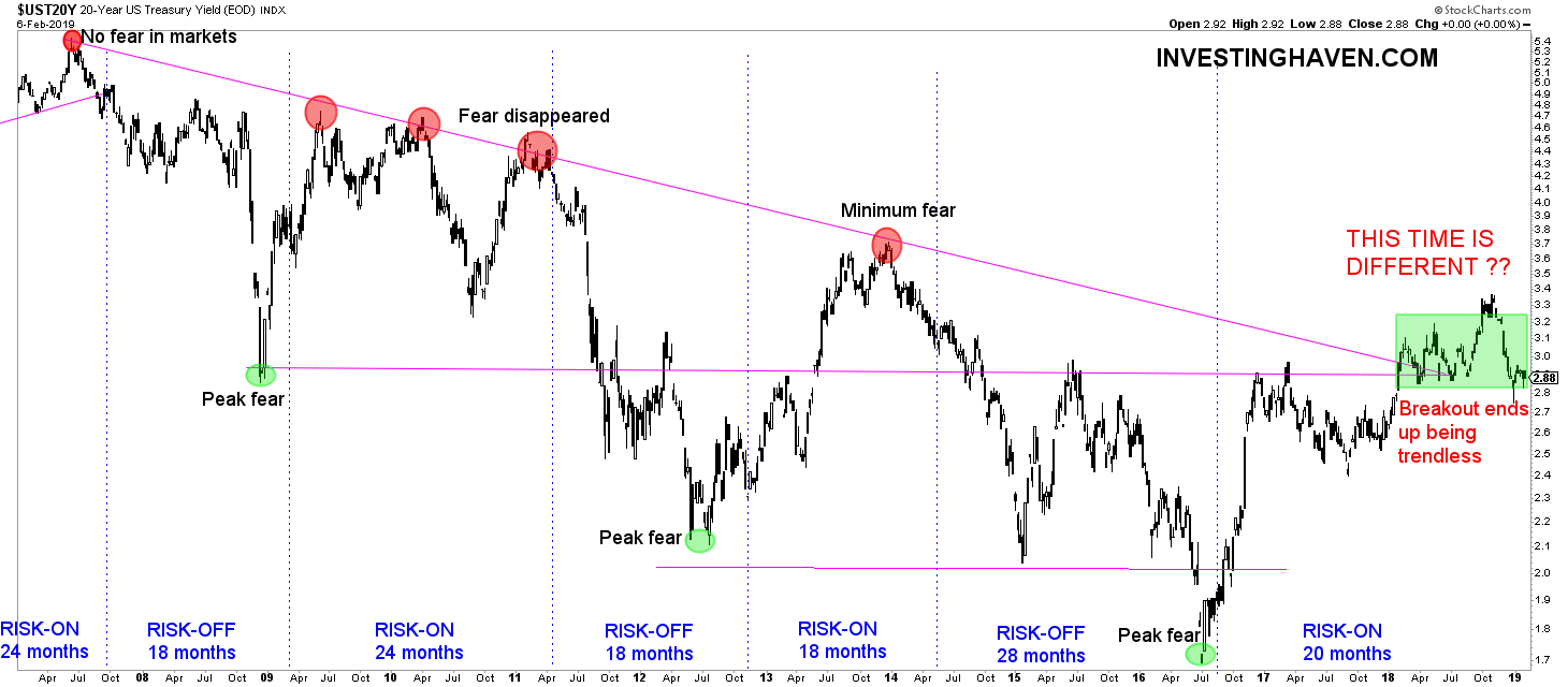 At this point in time we would not believe it is justified to go all-in broad stock markets. We may see a strong move, but our leading indicator is not confirming this yete. There is a downside risk which we cannot neglect. The following chart makes the point. The green box shows the indecisiveness of yields, and as it is a leading indicator for stocks it also implies indecisiveness of stocks.