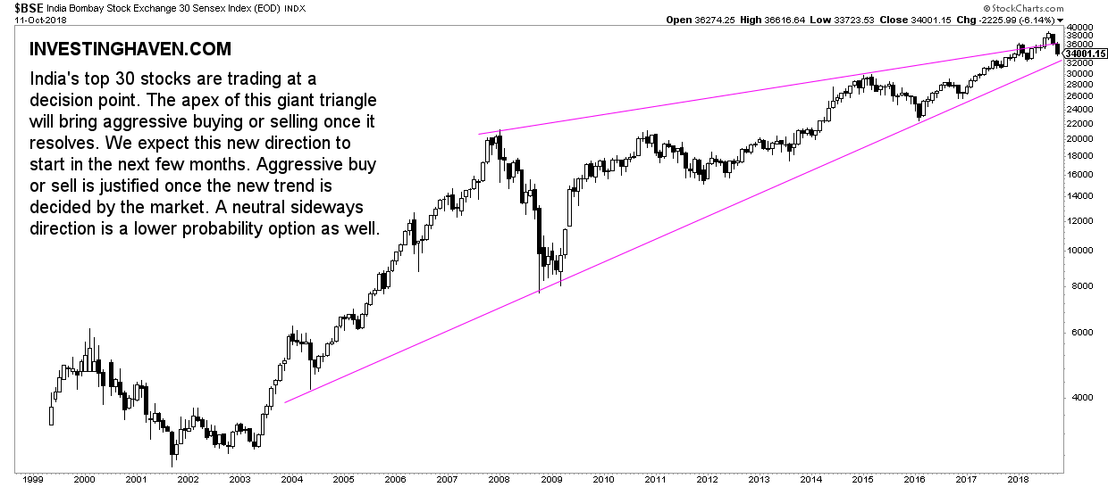 The BSE index representing the largest 30 Indian stocks has a giant triangle formation, not often seen. Especially the duration of this triangle and how perfect this looks is amazing.