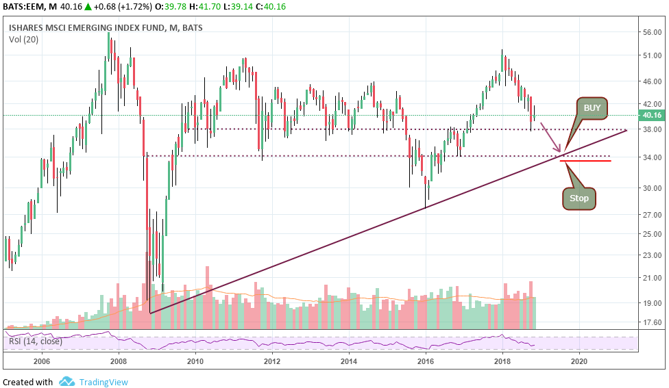 This chart suggests emerging markets are a juicy play. The 36 to 38 , arguably 36 to 40 area, is a good long term entry point. For risk management purposes we believe it is a good thing to have a stop loss in the 35 to 36 points area.