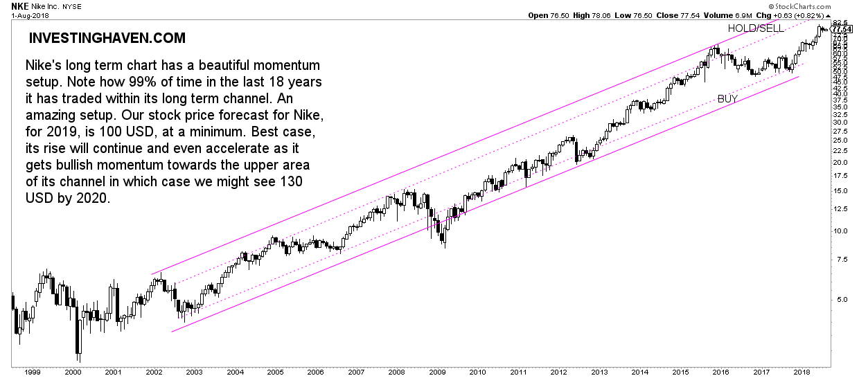 Taking the approach we outlined in this article we see that a bullish Nike stock forecast for 2019 and beyond is not only confirmed by its chart pattern but also by its financials and fundamentals. This leaves us with a high level confidence forecast of $100 by 2019, and, most likely, unless a crash takes place in broad markets, $130 by 2020.