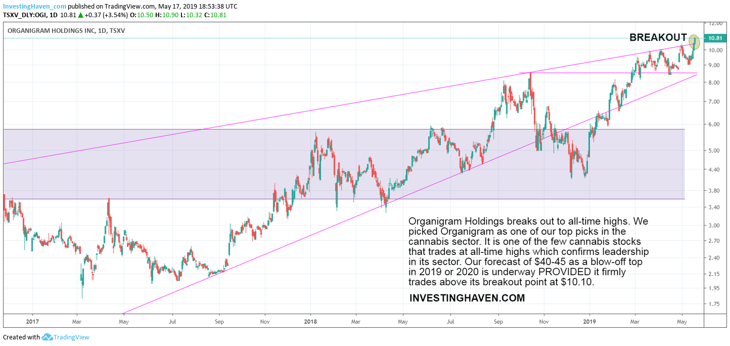 This is our conclusion published 2 months ago: “Organigram Holdings is one of the few cannabis stocks that trades at all-time highs which confirms leadership in its sector. Our forecast of $40-45 as a blow-off top in 2019 or 2020 is underway.”