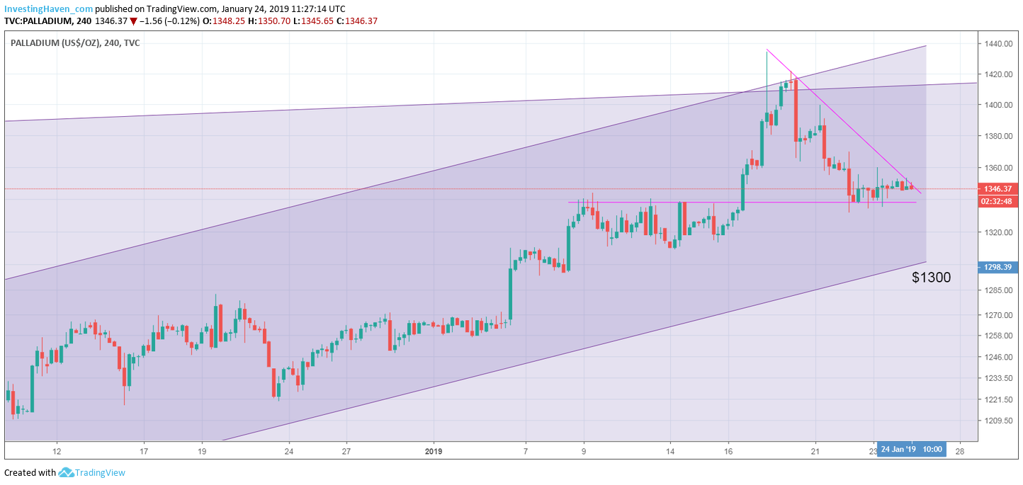 On the very short term we are looking at how the price evolves in this intersection of the 2 areas outlined in below chart. How palladium behaves at $1300 and $1420 as well as $1440 will be crucial.