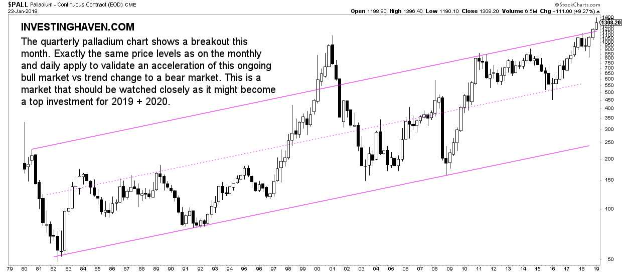 The quarterly palladium chart shows a breakout this month. Exactly the same price levels as on the monthly and daily apply to validate an acceleration of this ongoing bull market vs trend change to a bear market.