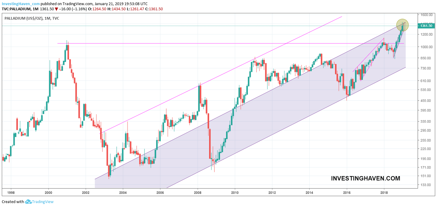 Our palladium forecast 2019 published 4 months ago had this palladium (PALLADIUM) price target of $1375. It got hit last week, in a blow off top fashion. The million dollar question is “what’s next”? We see two possibilities: either a major top was set last week (bearish scenario) or a new raging bull market that will bring palladium ultimately to $5000 by 2020. You read this correctly, and we are very serious that this is a realistic palladium price prediction for 2020: a 3.5x fold rise in the next 12 to 18 months.