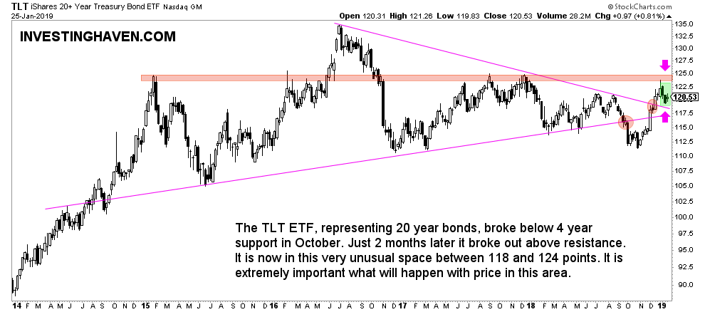What’s next in markets? After peak fear on a global market crash, and especially a stock market crash in 2019, the million dollar question is in which direction markets move next. 20 Year Treasuries which is one of our 15 leading indicators has a breath taking chart setup. Essentially, it is a very important risk barometer. Its chart shows a setup which leads us to the conclusion that this ultimate risk barometer is sandwiched. The resolution will be crucial for global investors in every market.