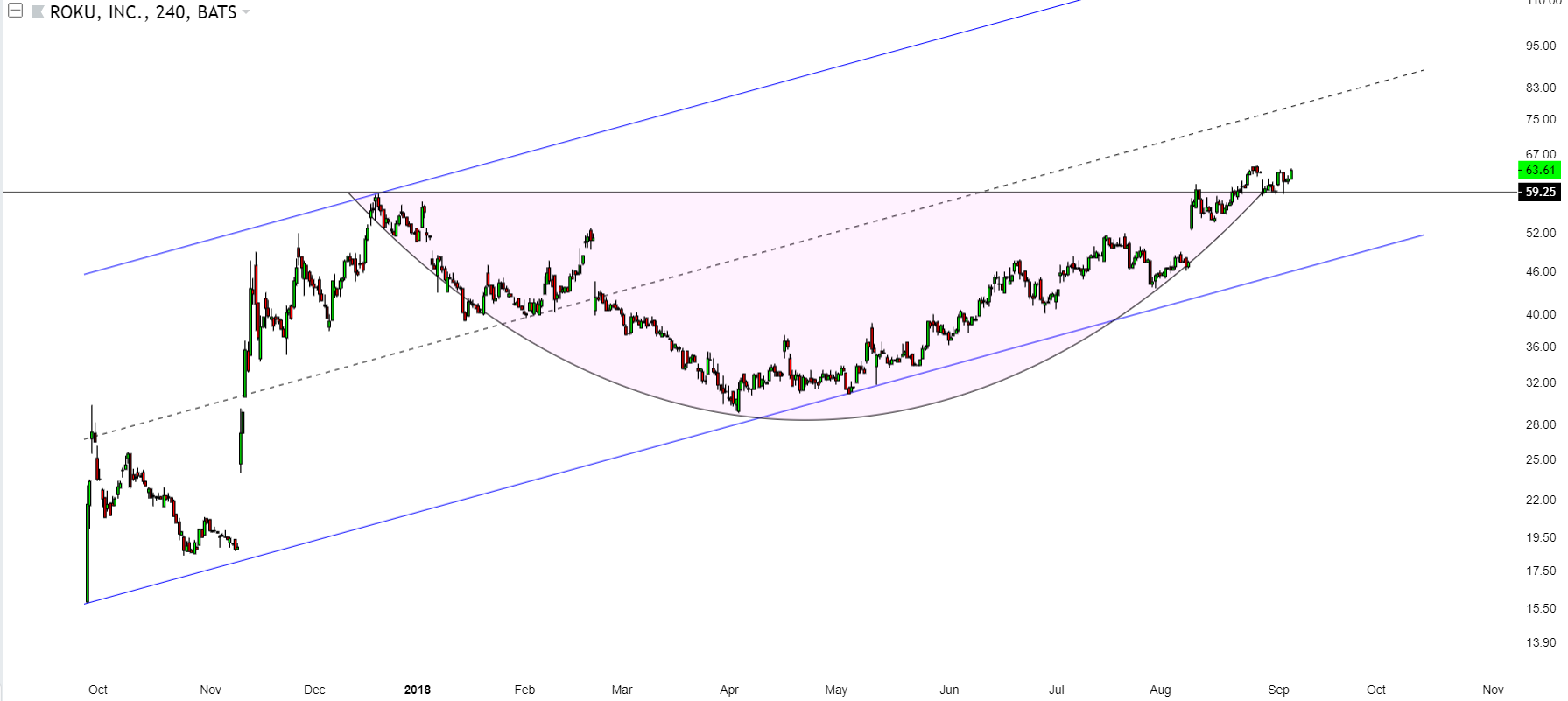 The chart of Roku shows on the one hand a rising channel and on the other hand a rounding bottom within the channel. That’s a powerful combination, one that you do not find very often, so smart investors notice this and know how to benefit from it!