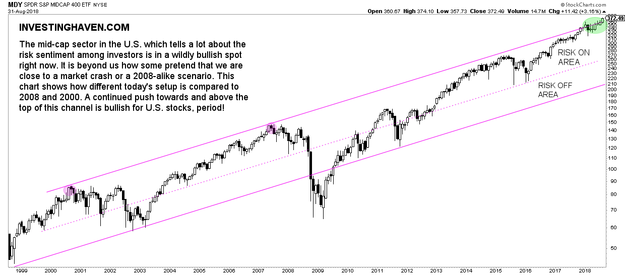 How many times, recently, did you notice media or analysts referring to a stock market crash similar to the 2008 crash? Quite often, most likely. It is unbelievable how anyone can buy this coming-market-crash story. All risk indicators, literally all of them, signal ‘risk on’ and a continuation, if not acceleration, of the grand stock bull market in 2018. Especially the mid-cap sector, one of our risk indicators, confirms the ongoing stocks bull market as well as ‘risk on’ in the second half of 2018!