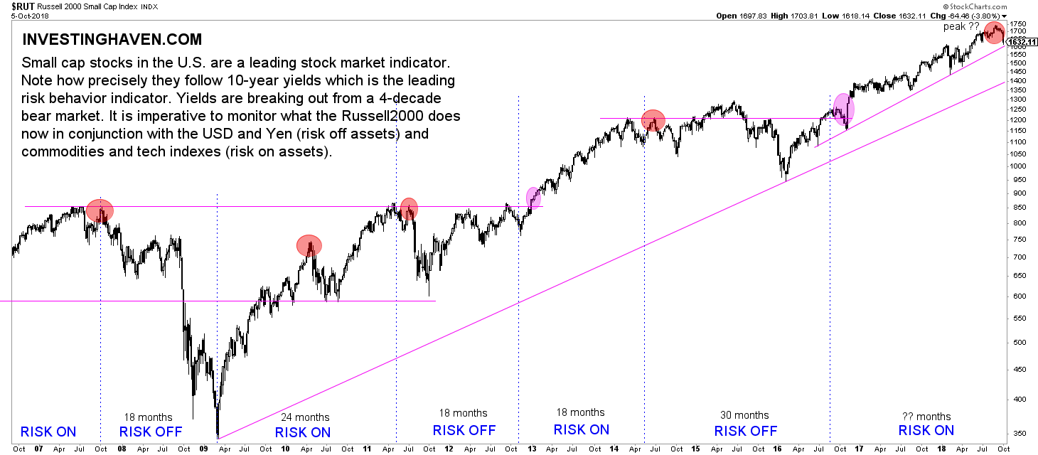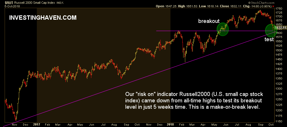 U.S. small cap stocks are one of our few ‘risk on’ leading indicators. If they do well it is a good time to invest in stocks while the opposite is true as well. Right now, at the start of October 2018, U.S. small cap stocks are at a make-or-break level. Is this the start of a Stock Market Crash In 2018 or the end of a temporary retracement?