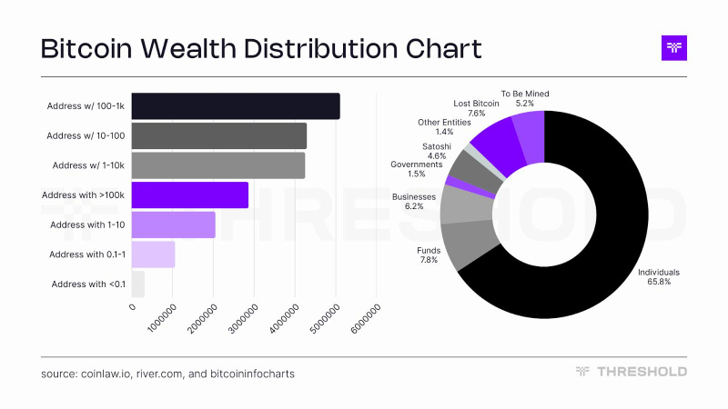 Recent analysis shows that 1M addresses hold over $100k; 157,000 hold over $1 million, and 19,142 addresses hold more than $10 million in Bitcoin. Together, these addresses represent an estimated $500 billion in value, a figure that has accelerated since U.S. spot ETF approvals in 2024. Although individuals control about 65.9% of the total Bitcoin supply, the majority are affluent investors rather than small retail holders.