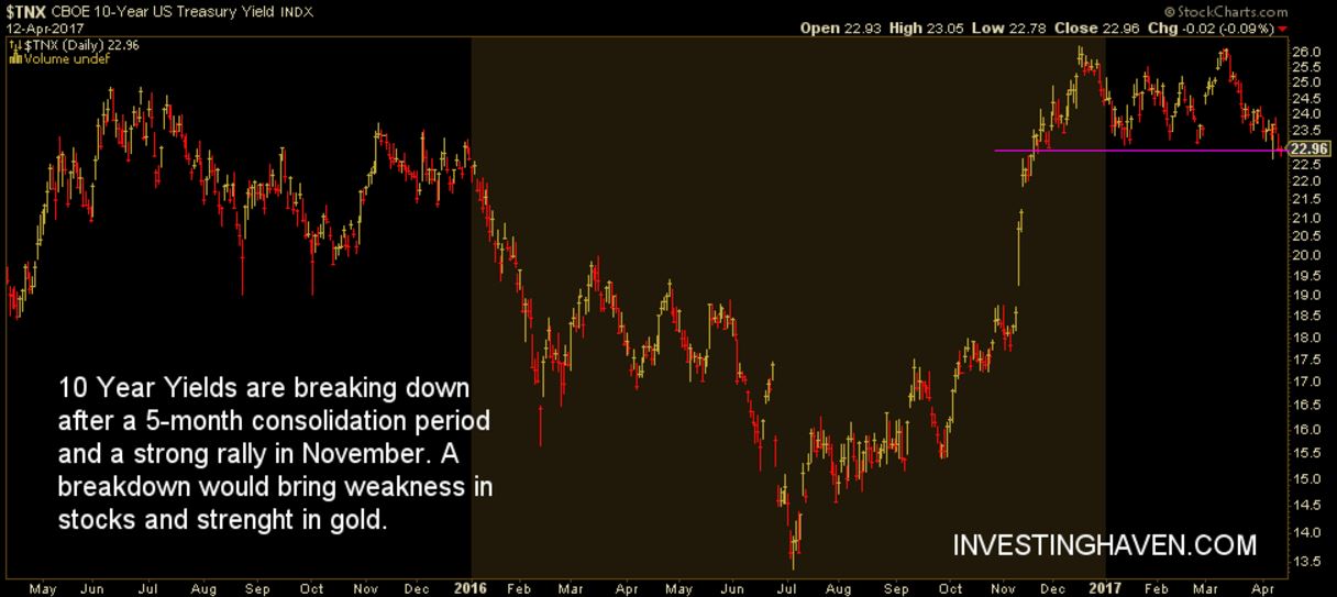 We consider 10-year yields as a leading indicator for both stock markets and bond markets because it is a risk indicator. That indicator is now on the verge of a tactical breakdown, and, hence, a tactical bear market. A breakdown, once official, implies weakness in stock markets and strength in bonds. Moreover, such a scenario would be good for gold.
