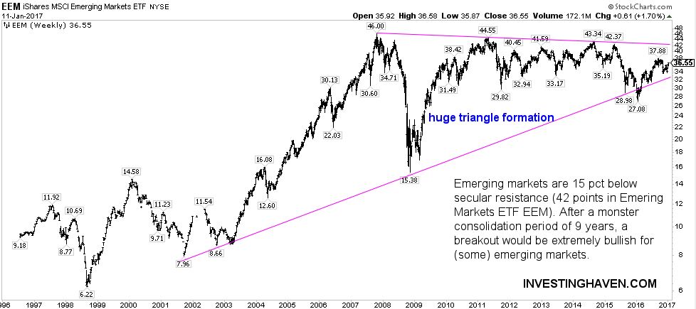 Emerging markets are right now 15 pct below secular resistance which comes in at 42 points in EMM (the best known Emerging Markets ETF). If the 42 level would be broken, potentially in a couple of months, we would see an extremely bullish period for emerging markets.