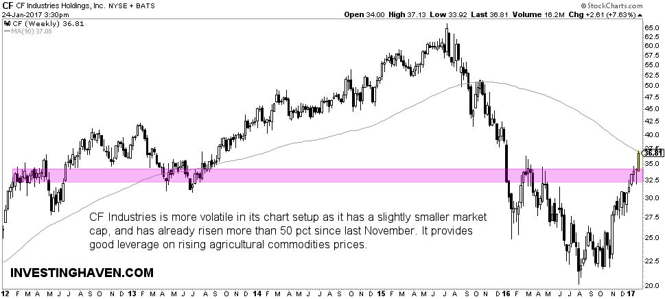 The chart setup of this stock is more aggressive than POT. The bottom of last year is less solid, its recent rise is much steeper. We would be a bit more cautious but this company is clearly providing leverage on rising agriculture commodities prices.