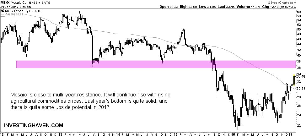 Last week, we reported momentum in the agricultural commodities market. We wrote Why Agricultural Commodities Could Start A New Bull Market In 2017. Meantime, agricultural commodities continue to show strength as evidenced by another rise of 1.7 percent of VanEck Vectors Agribusiness ETF (MOO) representing the sector. In this article, we identify 3 agriculture and potash stock with strong momentum which investors are watching closely in 2017.