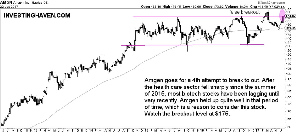 Amgen is a large cap with a $120B market cap. We covered its as a biotechnology breakout stock in March. However, at that time, it was a false breakout as indicated on below chart. Right now, Amgen is getting the full support of its peers so this breakout attempt is very likely to succeed!