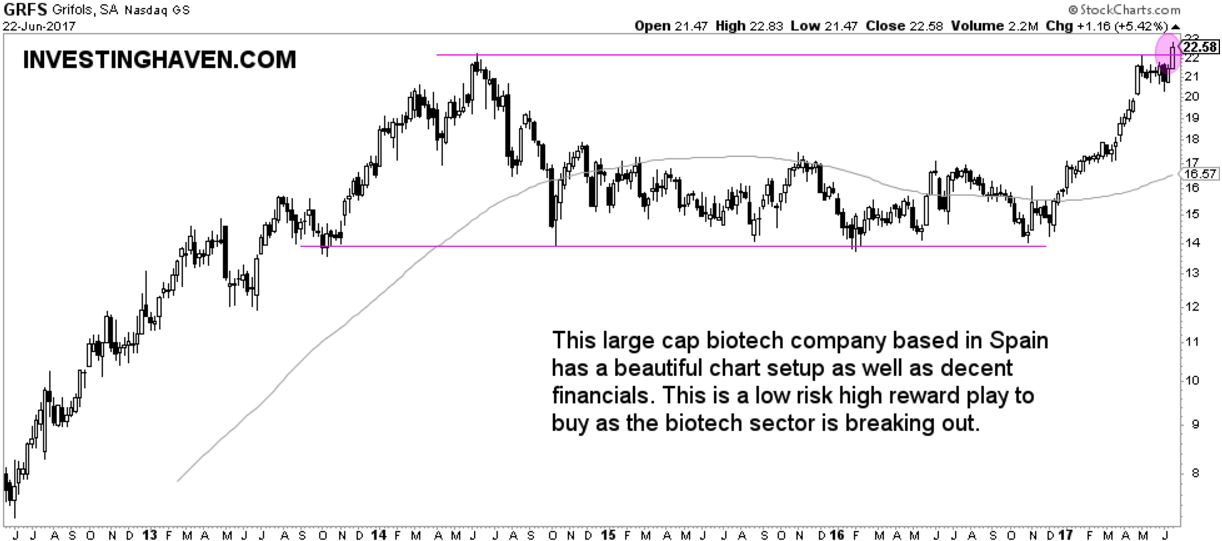 Last but not least, Grifols is a large cap with a $15B market cap. It is a biotech company based in Spain. It has solid financials, an ultra-low short float ratio, and a beauty of a chart setup.