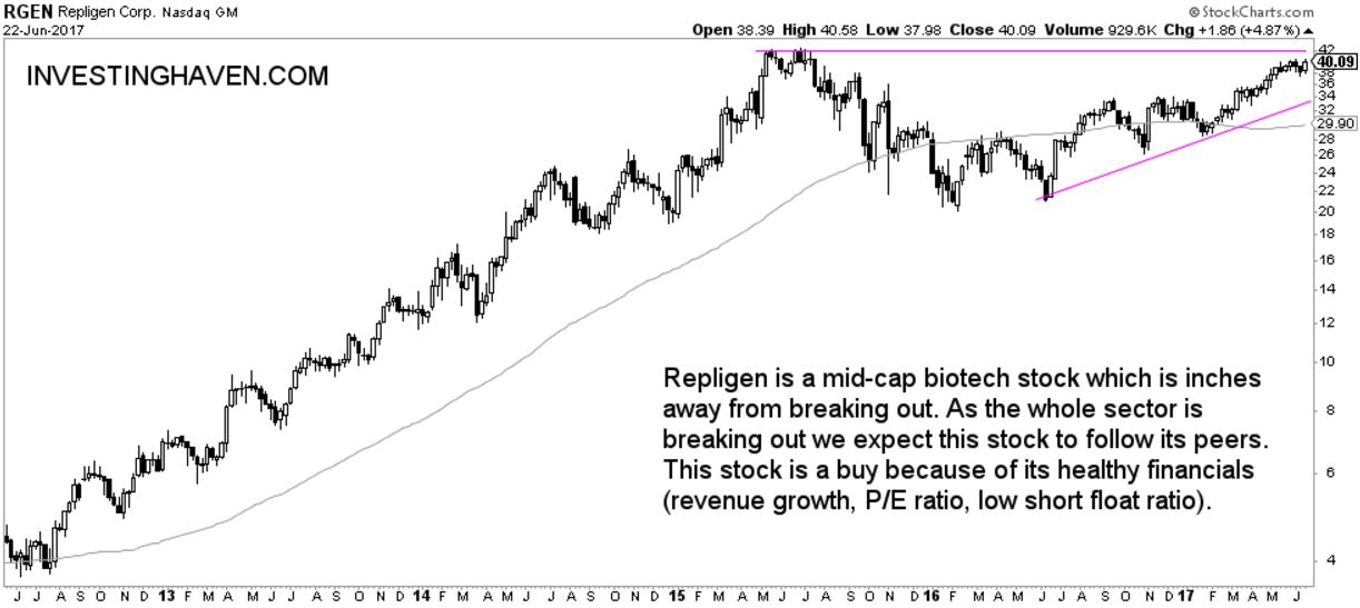 Repligen (REGN) is a $1.3B valued stock (mid-cap). It has very healthy financials: rising revenue (both monthly and quarterly), rising earnings, relatively low short float ratio. The P/E ratio is definitely at the high side, but given the rising earnings per share this is acceptable.