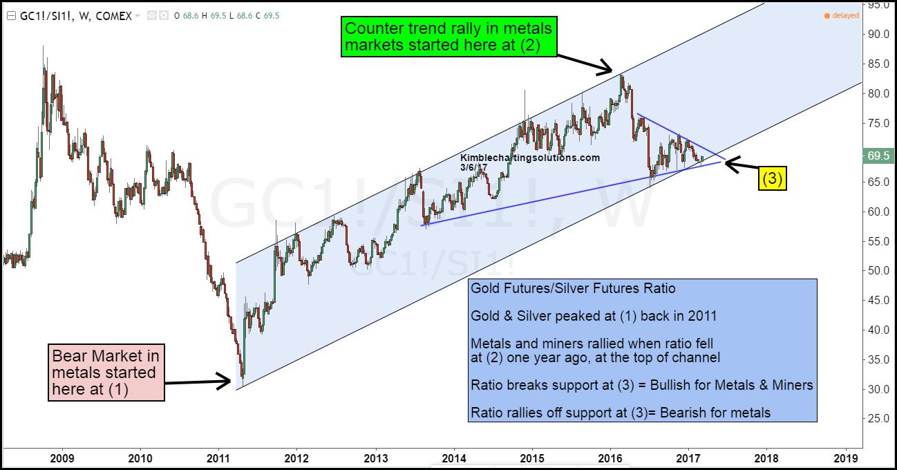 The 9-year gold to silver price ratio chart shows how the ratio arrived at major support. If the ratio goes higher from here, in other words if silver lags behind compared to gold, the ratio would turn up. Chart courtesy: Kimblechartingsolutions.