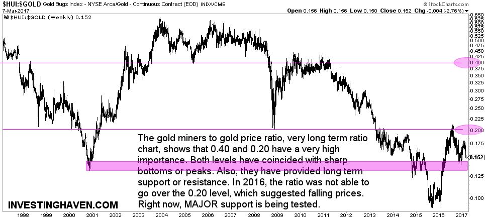 The third chart is the gold miners to gold price ratio. It shows how the ratio is entering major support right now, and that area was also tested during the lows of 2000 and 2014. If the purple area holds, it would be bullish in the medium term. If it does not hold, we could see another (last?) capitulation in the gold market.