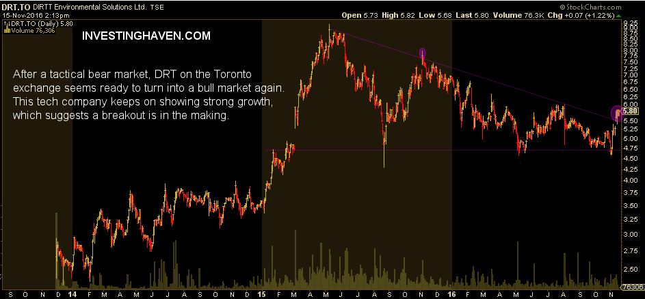 It is no coincidence that the share price of DIRTT jumped after its quarterly results from support to resistance in its long term chart pattern, as seen on the chart. Right now, the stock is attempting to break out. Given strong and steady growth, based on a solid 3D software application, we believe the stock will be challenging previous all-time highs in 2017.