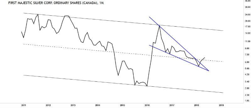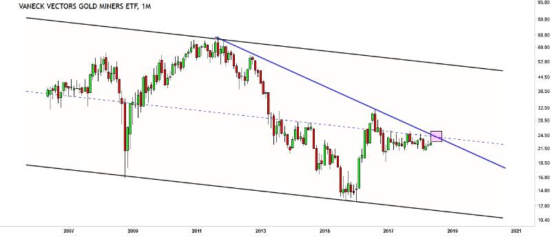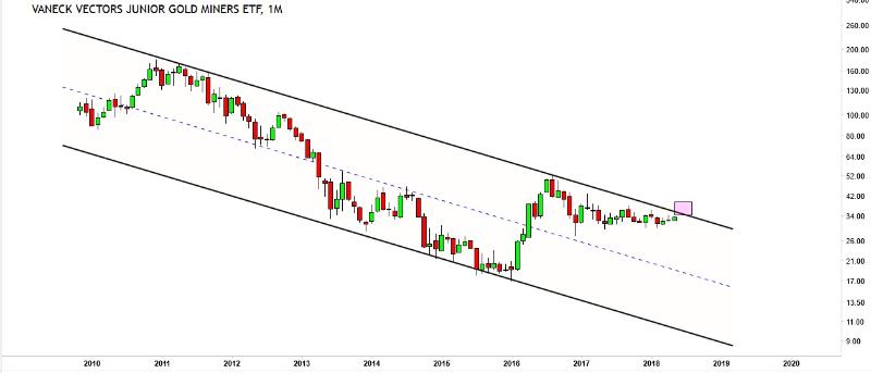 The GDXJ has a similar setup: they will need a strong bullish push to break the 7 year downtrend channel to change the bearish trend into a bullish trend.