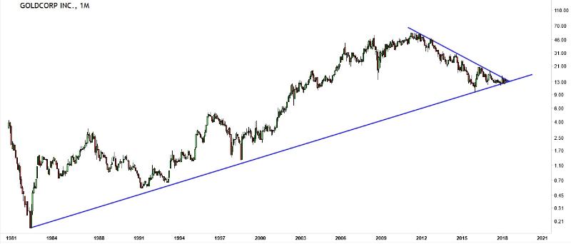 This is another Canadian based company that is engaged in gold mining and related activities including exploration, extraction, processing and reclamation. The monthly chart of GG is very interesting. Its price is involved in a tug-o-war between bulls and bears settling between 12-15 at the apex. Something will have to give, and likely in the near term. Again, if gold breaks out, Goldcorp is expected to provide leverage to the upside. Its bullish case: price will break above to challenge 19-20 and further north of 29 and even 56, which is many multiples of today’s price! The bearish case: price would be breaking down and proceed to challenge 9.5, and previous major support sits around 5.3.