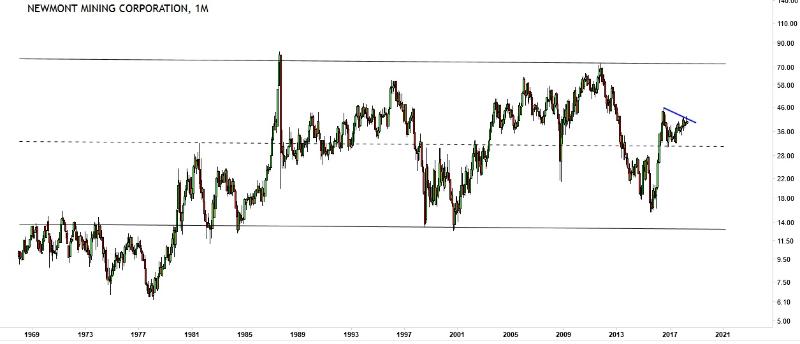 Since 1980, the stock price of Newmont Mining is trapped in the horizontal channel with a price range between 13.50 – 74 USD. Very recently, price has been in a consolidating trangle. In case it breaks the blue upper triangle line there is a chance for price to challenge the 72 area again within next years. Let’s not forget the bearish case: it could fail to break out and reverse back to 31 or lower.