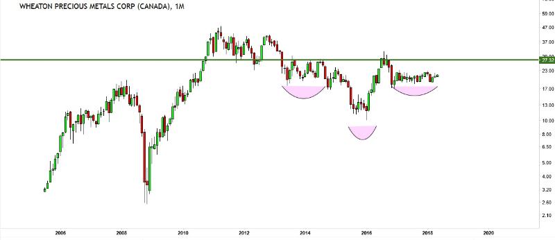 Canadian base silver mining company WPM is making a potential inverted head and shoulders formation which started in April 2013. Note that the inverted right shoulder is NOT completed, yet it seems likely that this is the pattern that is in play. The bullish case: price will complete the formation of its shoulder before challenging the neckline price of ~27.3. Breaking out would send the price to the 46 area again. The bearish case: if price is going to reverse ~18 will be crucial support, and, ultimately, ~10.80.