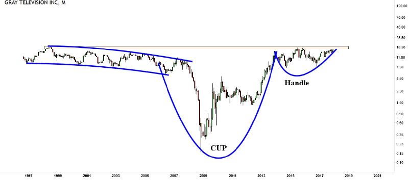 Interestingly, for the first time InvestingHaven identified the monthly chart of GTN as cup and handle with a distinctive spout! Major resistance kicks in at `18-19. In case price breaks out above this level the conservative 2018 target will be ~30 before moving towards ~45 beyond 2018. As always, if the breakout turns out to be weak there is a tendency for price to fall back and retest the 18-19 area.