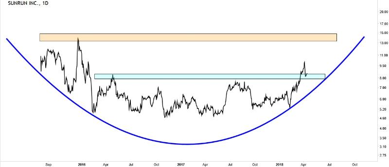 Sunrun only began trading on Aug 2015, hence we look at the daily line chart. The entire price structure seems to fit into rounding bottom so far. Ever since hitting a high of 13.8, its price dropped back to a low of 4.9 and then hit the ceiling at about 8.3 which continues to consolidate for two years before prices finally break above 8.3. Seems like price has found decent support at around 7.8 – 8.3, and, if this remains strong, its price could consolidate a little longer before proceeding to challenge secular resistance at 13.8. Should prices break below 7.8 or even below the blue line we would change the outlook to a clear bearish bias.